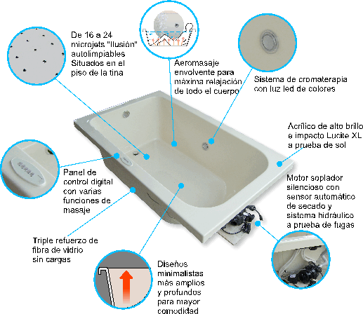 El principio del masaje a base de aire es sencillo: Un motor soplador impulsa aire previamente calentado a temperatura idónea a traves de pequeños jets estratégicamente situados en la tina produciendo millones de burbujas que presionan firme pero gentilmente los músculos cansados de todo el cuerpo para ofrecer un masaje envolvente integral.